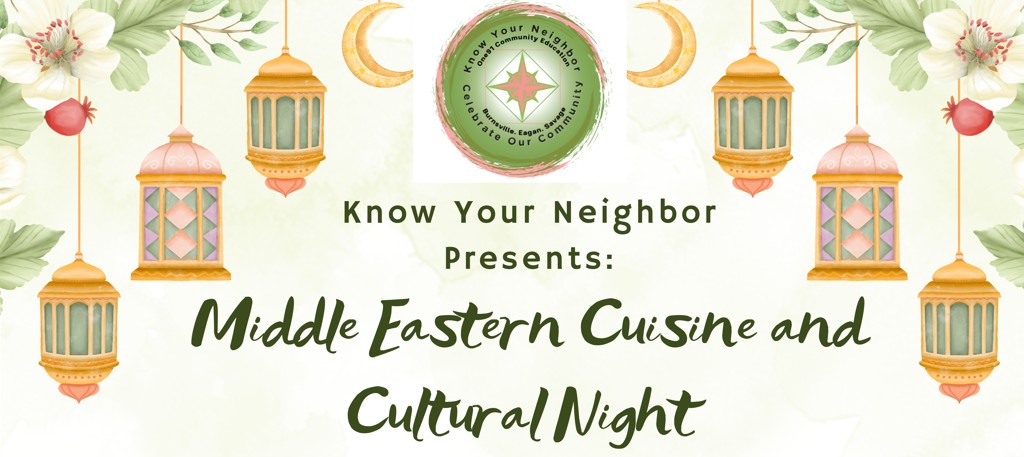 Know Your Neighbor community dinner featuring Middle Eastern cuisine and cultural activities. A celebration of diversity and community.