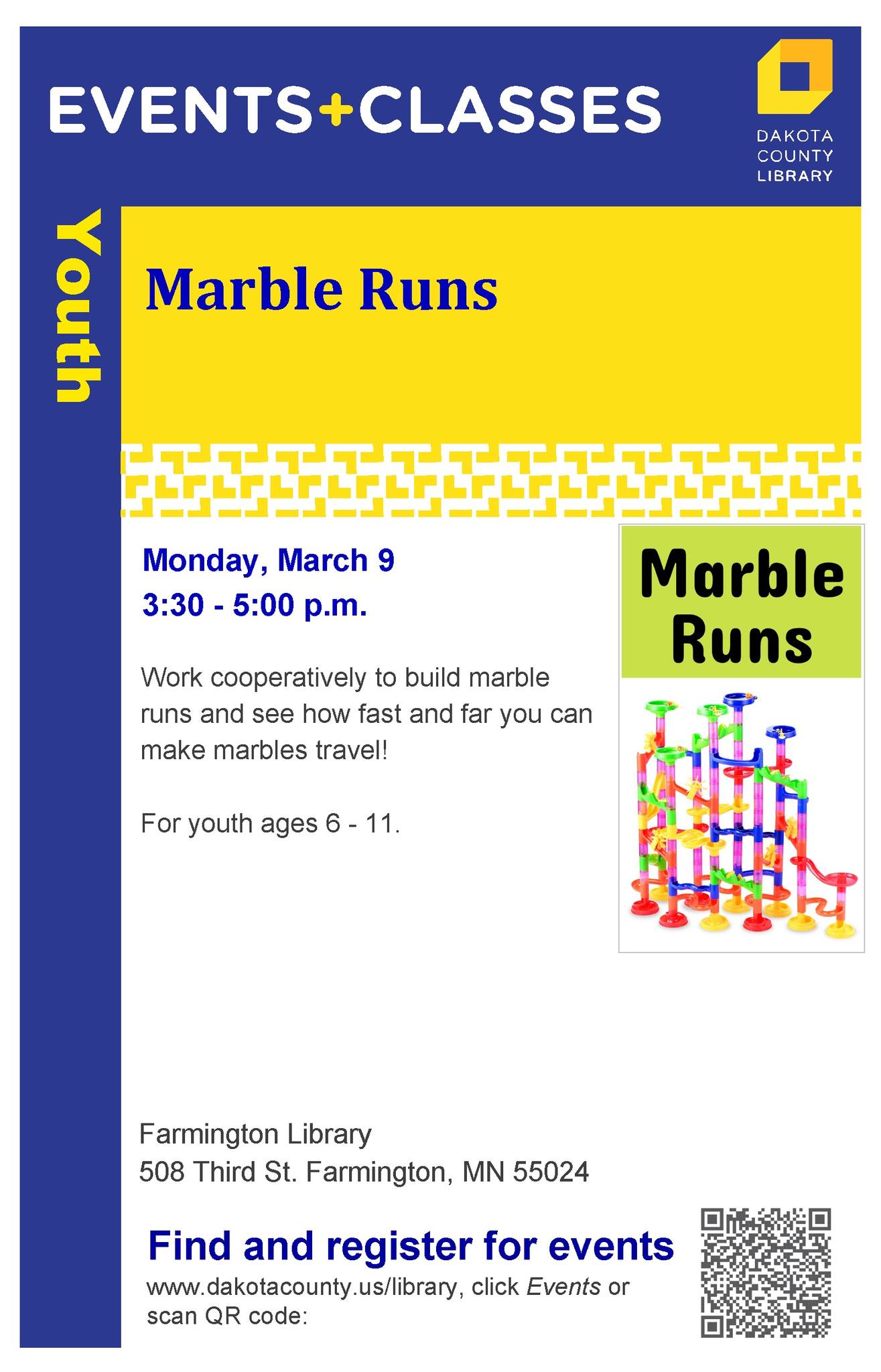 Work cooperatively to build marble runs and see how fast and far you can make the marbles go. A fun STEM activity at the Farmington Library for kids and families.