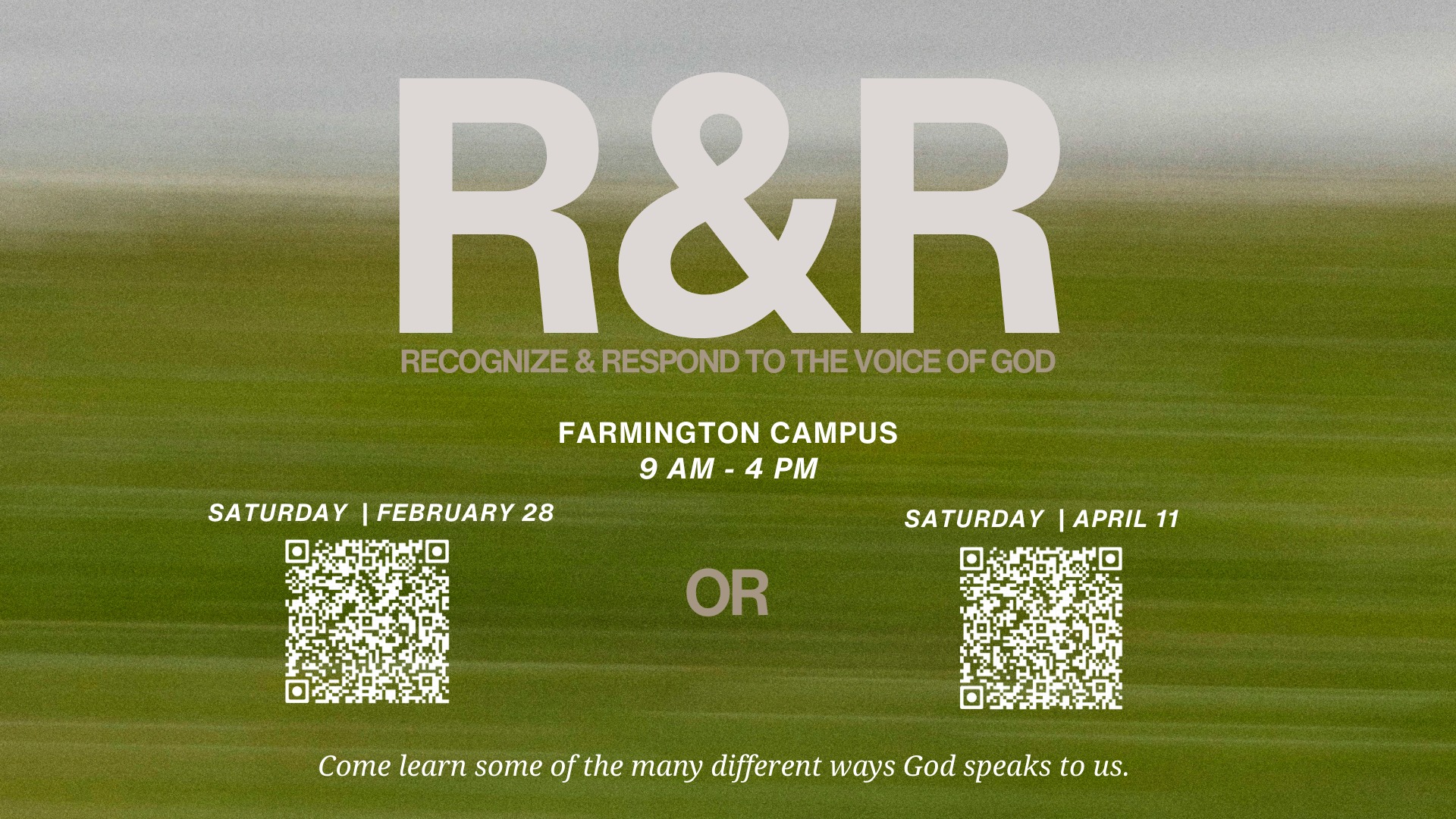 R&R: Recognize and Respond to the Voice of God. A faith-based gathering at the Farmington Campus focused on spiritual growth and learning to discern God's guidance.