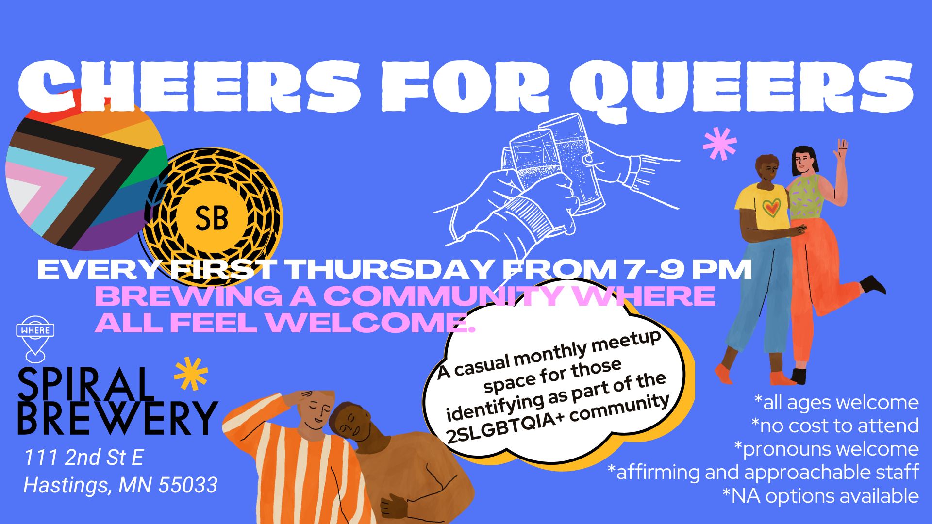 Casual monthly meetup for the 2SLGBTQIA+ community at Spiral Brewery. No cost to attend. All ages welcome. Recurring first Thursday of each month.