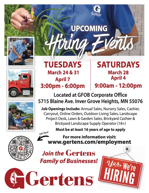 Gertens is hiring for the spring season. Attend this hiring event to learn about available positions and apply on the spot.