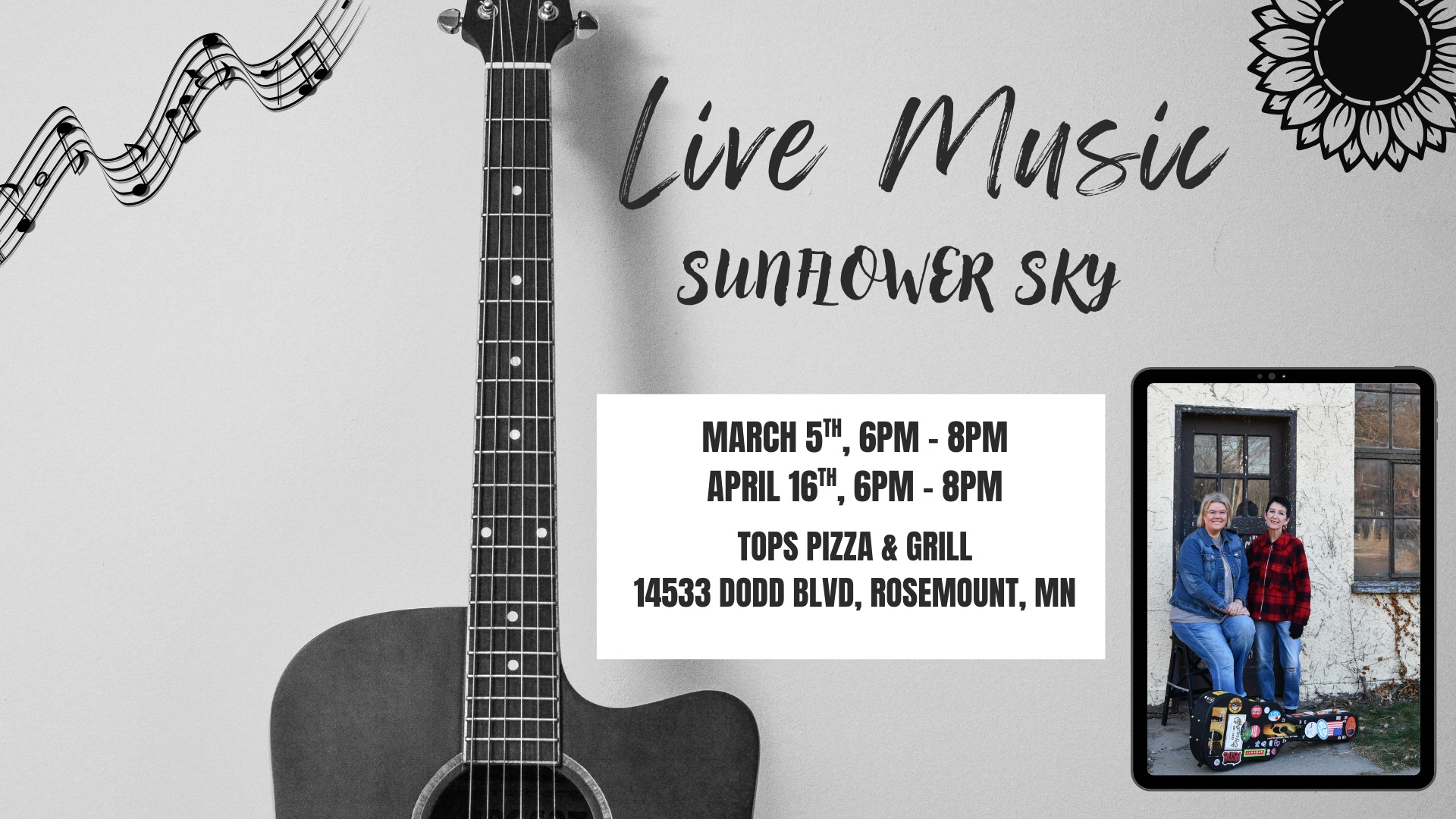 Join us for Sunflower Sky Acoustic Duo at Tops Pizza & Grill, located at 14533 Dodd Blvd, Rosemount, MN.