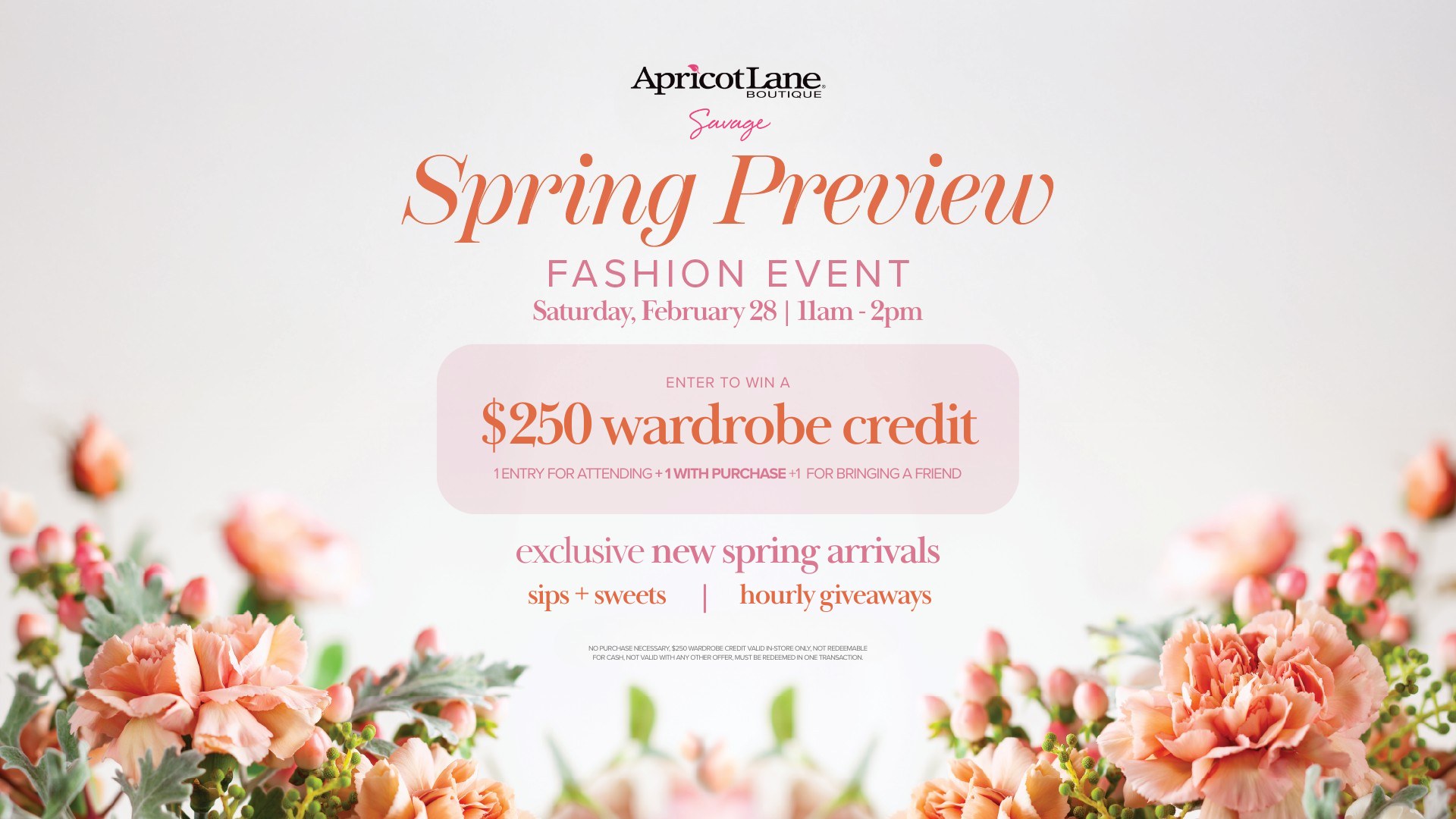Apricot Lane Spring Preview fashion event. Shop the latest spring arrivals with a $250 wardrobe credit giveaway.