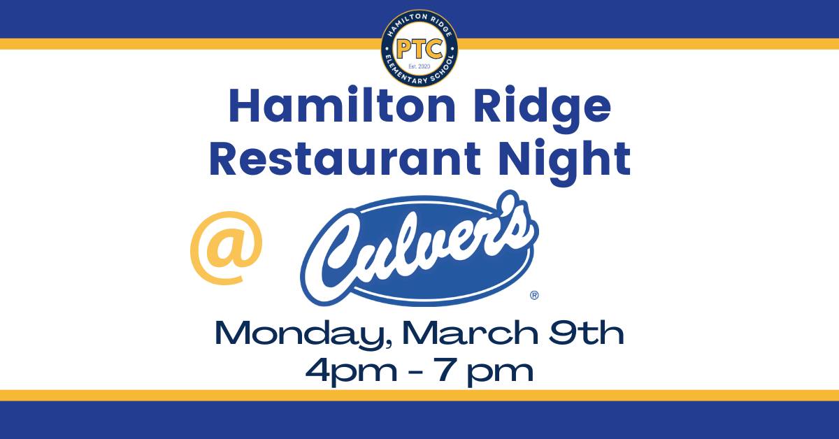 Hamilton Ridge Restaurant Night at Culver's in Savage. Dine and support the school community.