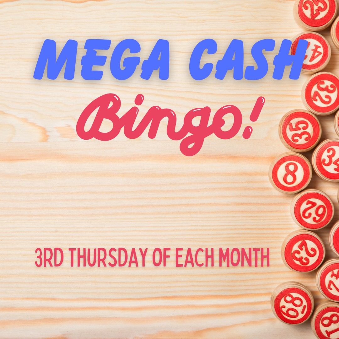Mega Cash Bingo with cash prizes up to $30 to $55 per game.