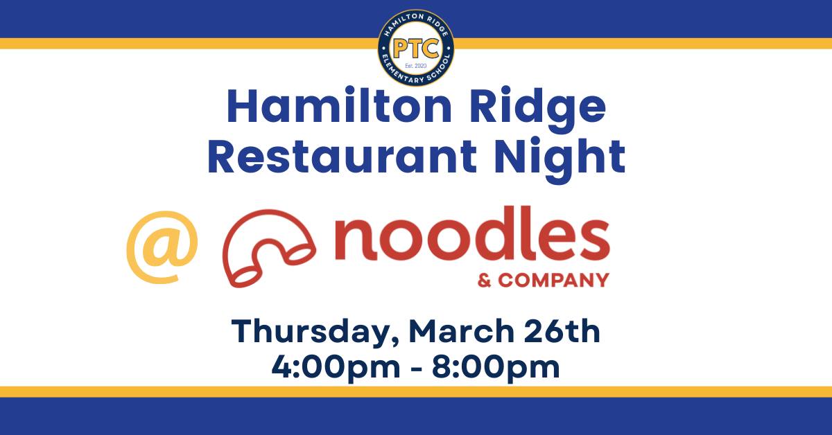 Hamilton Ridge Restaurant Night at Noodles & Company. Dine and support Hamilton Ridge Elementary from 4-8 PM.